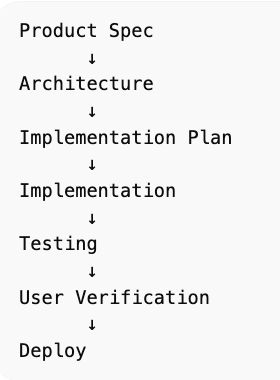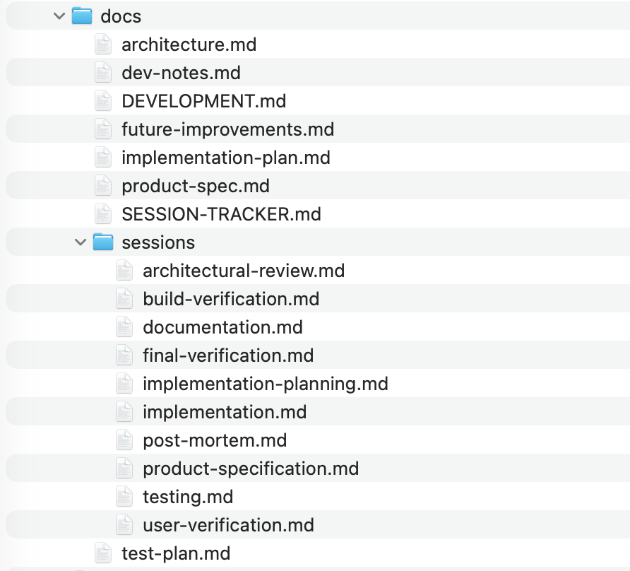 Instead of one long AI conversation doing everything, development is split into structured sessions.